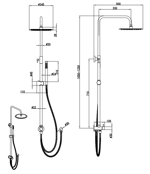 - מוט מעוצב עגול. מזלף מחליף מצבים וראש מקלחת בעיצוב עגול.