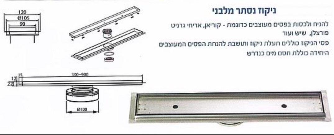תעלת ניקוז נסתר מלבני נירוסטה 60 ס"מ ,